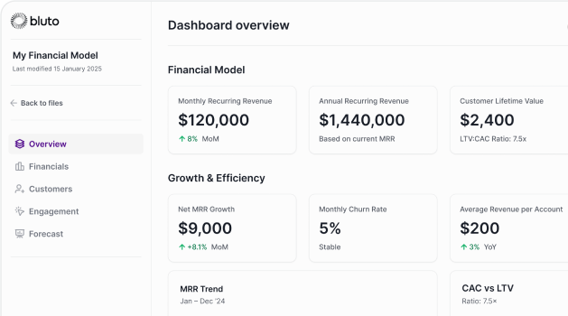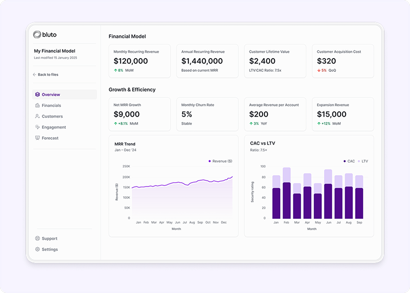 Customer acquisition costs and payback. Monthly and annual recurring revenue. Burn rate and runway calculations.