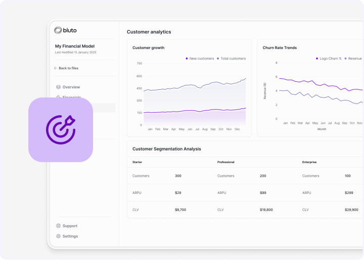 Revenue build-up from customers to cash. Operating expenses that scale with growth. Cash flow that accounts for timing differences.