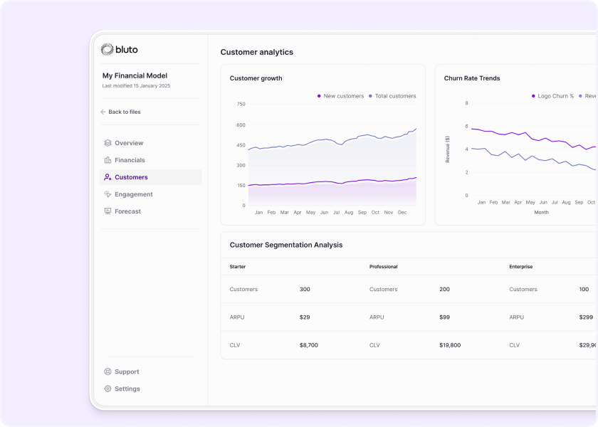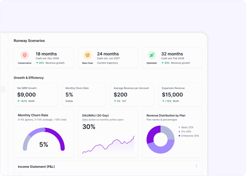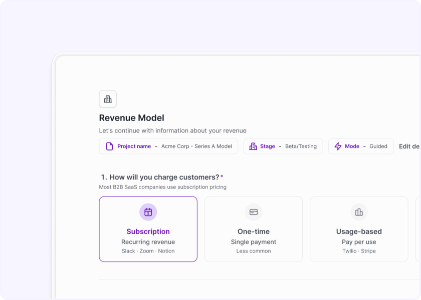 Industry-specific modeling with the metrics, benchmarks, and revenue structures investors expect. Start with proven approaches that match how your business actually works.