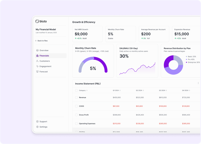 MRR waterfalls, cohort retention, and unit economics. Model subscription businesses the way investors expect to see them.